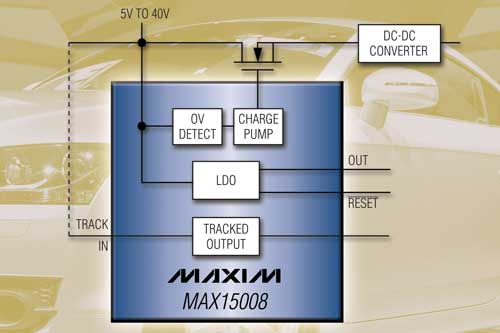 Maxim推出高度集成、用于汽车电子的300mA线性稳压器" title="线性稳压器">线性稳压器MAX15008/MAX15010,具有电压跟踪器" title="跟踪器">跟踪器和抛负载保护。该低压差(LDO)稳压器集成了可靠的保护电路" title="保护电路">保护电路,能够承受恶劣的工作环境;器件工作于5V至40V宽电源电压范围,可承受高达45V的抛负载瞬态电压。MAX15008/MAX15010可跟踪输出电压,并能向远端传感器提供高达50mA的电流,从而可在汽车电子应用中实现精确的比例跟踪。电压跟踪器具有±3mV的跟踪精度,以及电池反向和短路保护。可靠的保护特性以及电压跟踪功能,使器件成为仪表盘、环境控制和电源电路等汽车传感器应用的理想选择。